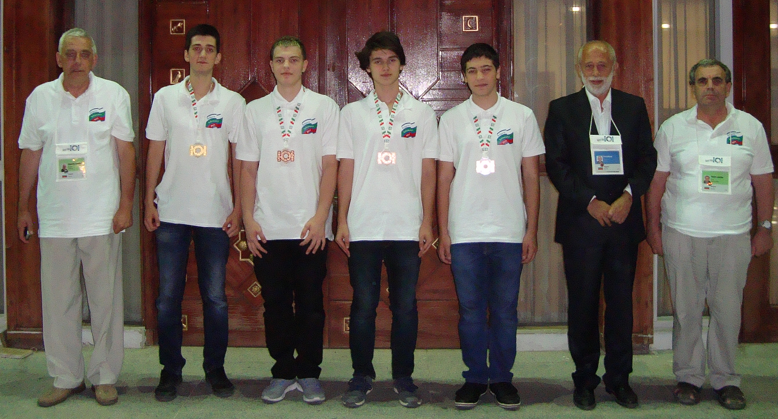 Снимката на българската делегация е направена след официалната церемония за награждаването. Отляво надясно: Руско Шиков – зам.-ръководител, Енчо Мишинев, Радослав Димитров, Виктор Терзиев, Петър Няголов, Красимир Манев – президент на МОИ, Емил Келеведжиев – ръководител на отбора.