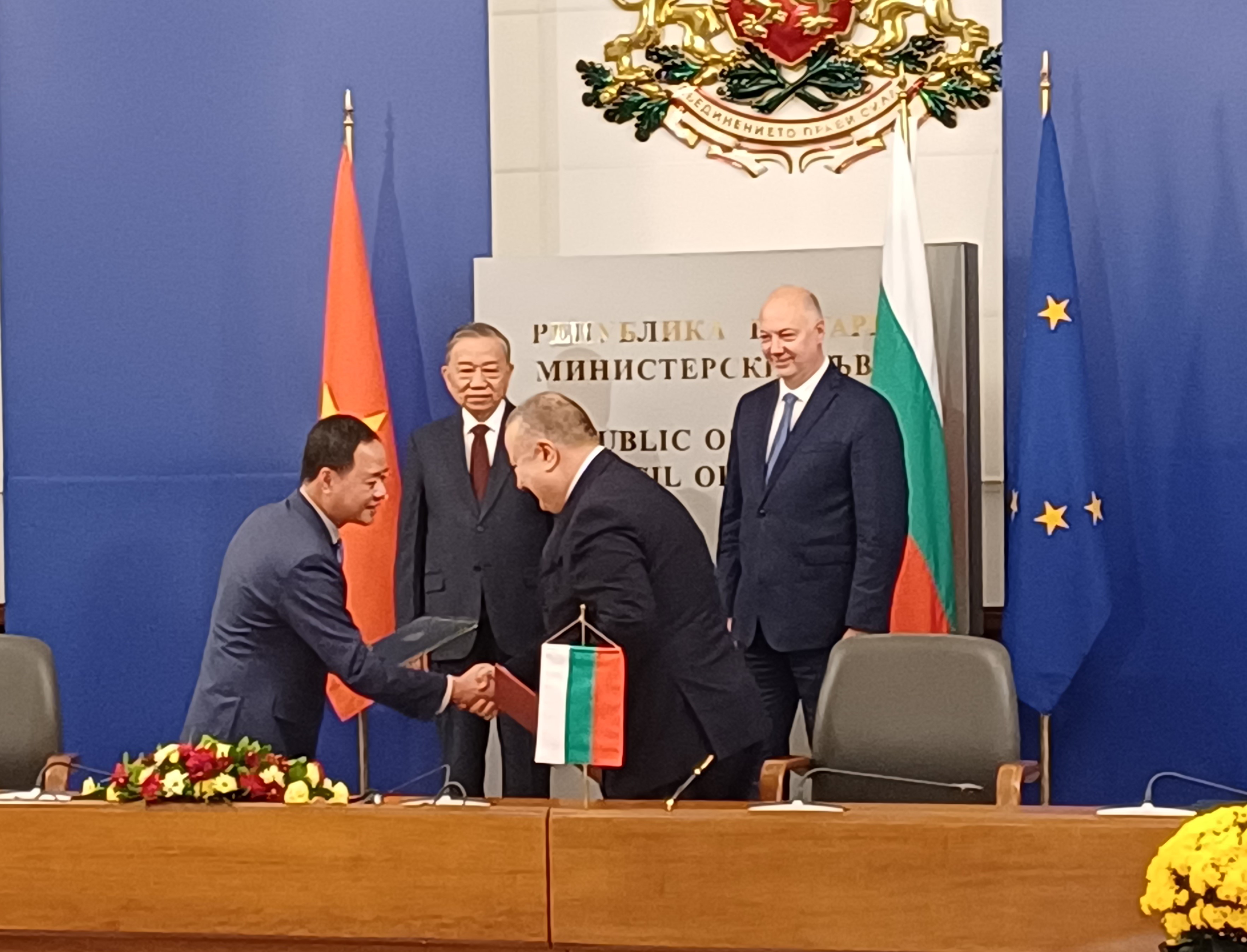 Днес, 24 октомври 2025 г., в Гранитната зала на Министерския съвет в присъствието на Н. Пр. г-н То Лам, генерален секретар на Централния комитет на Виетнамската комунистическа партия и Н. Пр. г-н Росен Желязков, министър-председател на Република България, се подписваха двустранни споразумения. Сред тях са: Писмо за намерение между Министерството на националната отбрана на Социалистическа република Виетнам (СРВ) и министерството на отбраната на Република България за разширяване на военното сътрудничество; Меморандум за разбирателство между Министерството на вътрешните работи на Република България и Министерството на обществената сигурност на Социалистическа република Виетнам за сътрудничество в областта на киберсигурността и борбата с високотехнологичните и киберпрестъпления; Меморандум за разбирателство между Министерството на електронното управление на Република България и Министерството на науката и технологиите на Социалистическа република Виетнам за дигитално сътрудничество и др. В подписването на междудържавните споразумения и документи участваха: г-н Георг Георгиев, министър на външните работи; г-н Валентин Мундров, министър на електронното управление; г-н Даниел Митов, министър на вътрешните работи; г-н Радостин Илиев, заместник-министър на отбраната; г-н Фан Ван Занг, член на Политбюро, Министър на отбраната на СРВ; г-н Луонг Там Куанг, министър на обществената сигурност на СРВ; г-н Ле Хоай Чунг, и. д. министър на външните работи на СРВ; г-н Нгуен Ман Хунг, министър на науката и технологиите на СРВ и др.