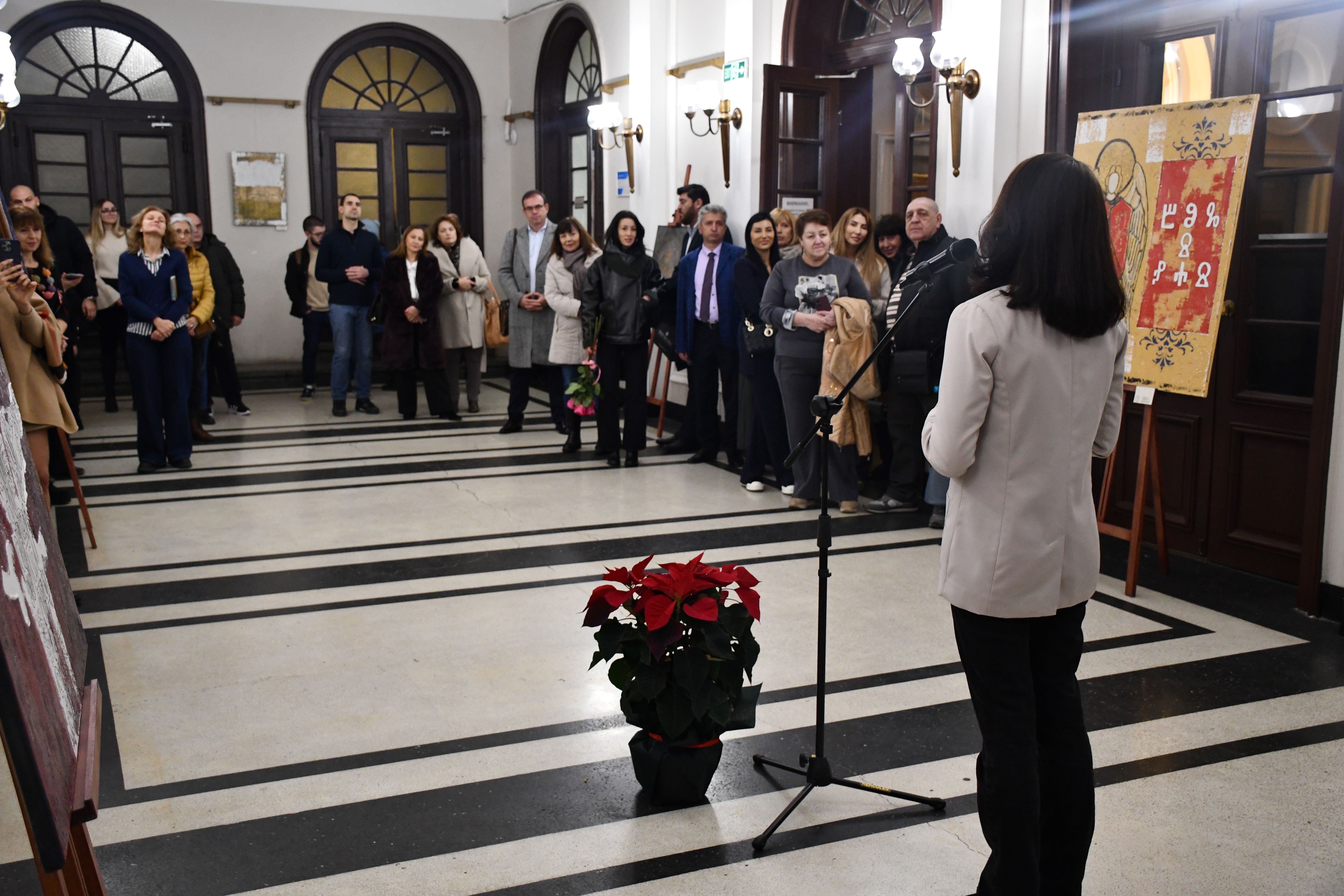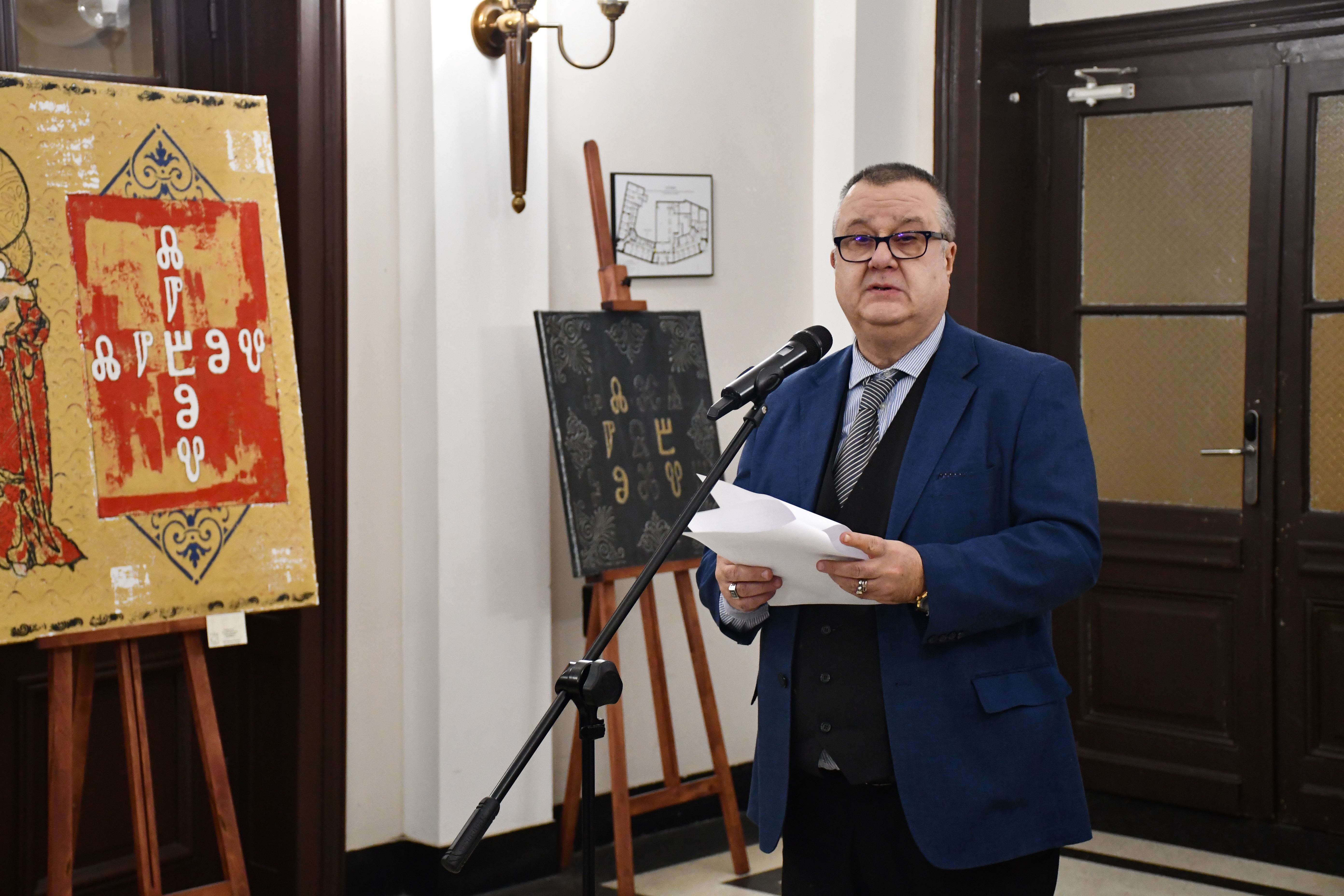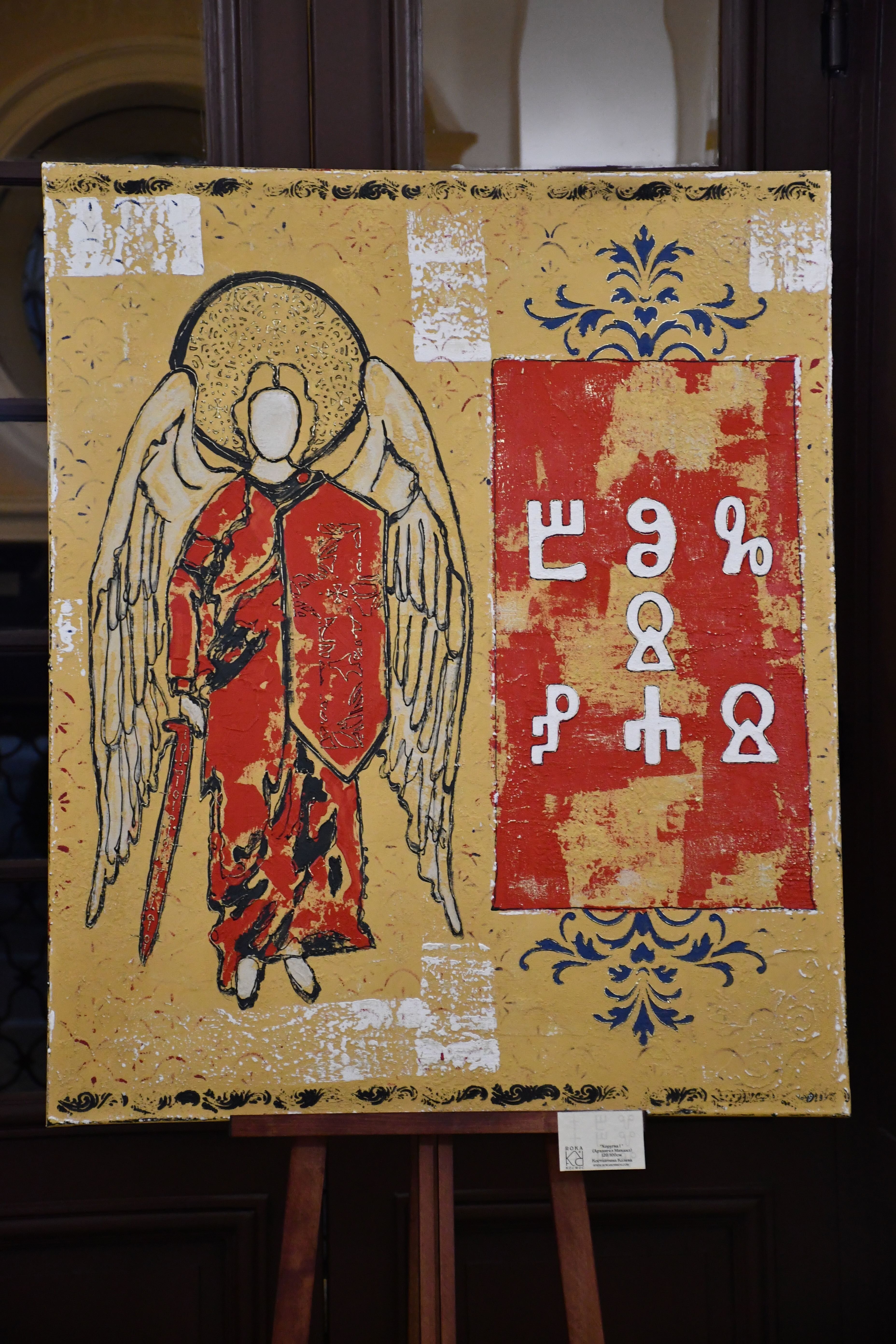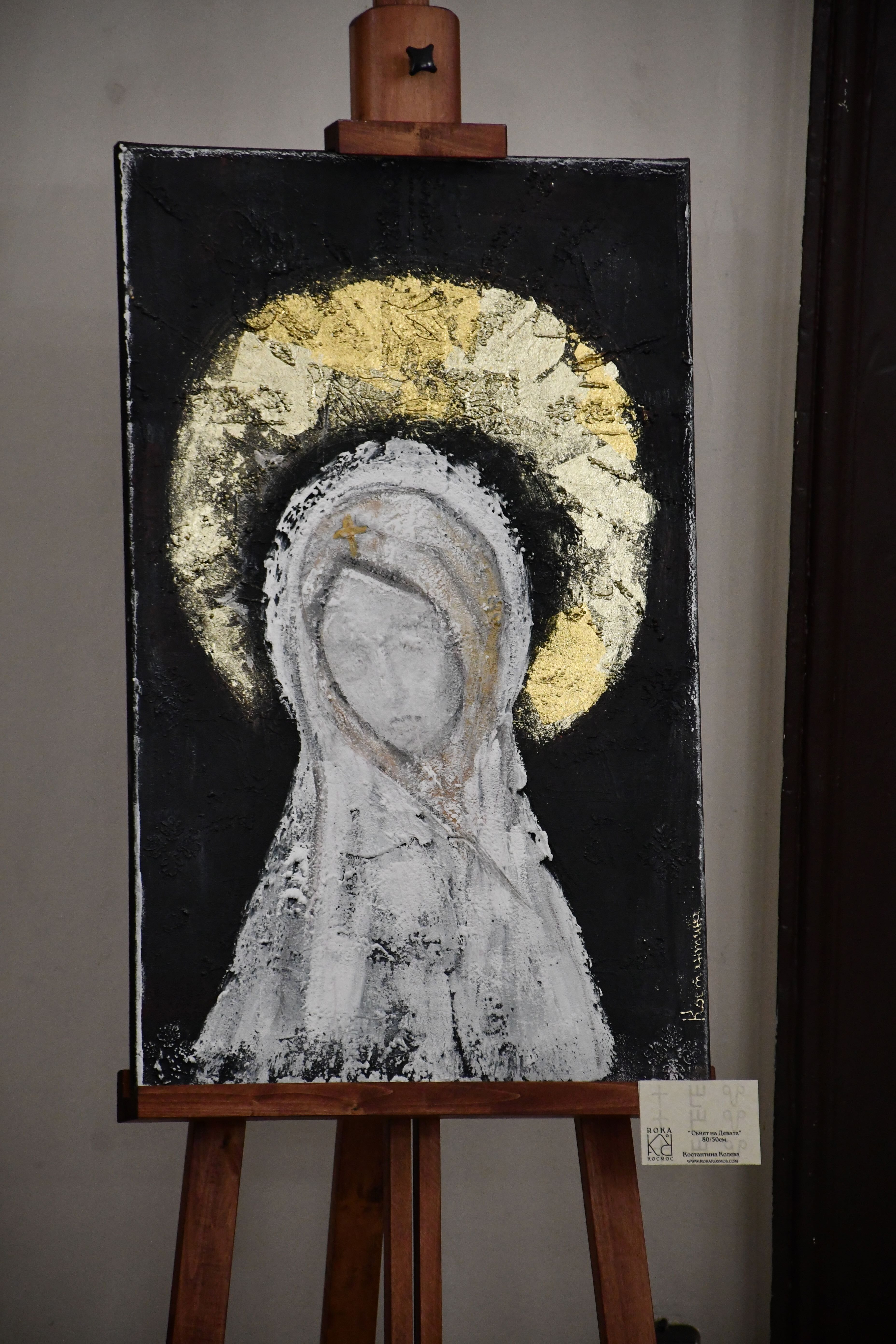 Заместник-председателят на БАН проф. Емануел Мутафов откри изложбата и представи авторката. „Преди седмица тук стояха картините на майстор на декоративното, на пейзажа и на цвета като Яна Петкова, а днес ви представяме един по-скоро самороден и доста опърничав талант, който подхожда към творчеството концептуално. Стандартният български художник се отдава на моментната или отгледана емоция и я излива върху платното без да се наема да обясни нито детайли от творческия си процес, нито идеята, която иска да вложи за зрителя. Той разчита на неговата сетивност, на предварителната му подготовка, на изобретателността му дори. Костантина обаче подхожда съвсем различно – тя е влюбена в глаголицата, в Православието, държи на корените си, проучва ги и ги представя със средствата на дюлгера. И накрая ги размазва до безобразие, за да изглеждат като стари артефакти, открити при разкопки, каквито всъщност те не са. Затова творбите ѝ подхождат на пространства свързани с археологията, с книжовността, религията“, каза в словото си зам.-председателят.