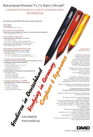 Германската служба за академичен обмен (DAAD), съвместно с Международна фондация „Св. Св. Кирил и Методий“ предоставят възможност за финансиране на обучението и изследователската дейност на български студенти, докторанти, университетски преподаватели и други учени. [...]