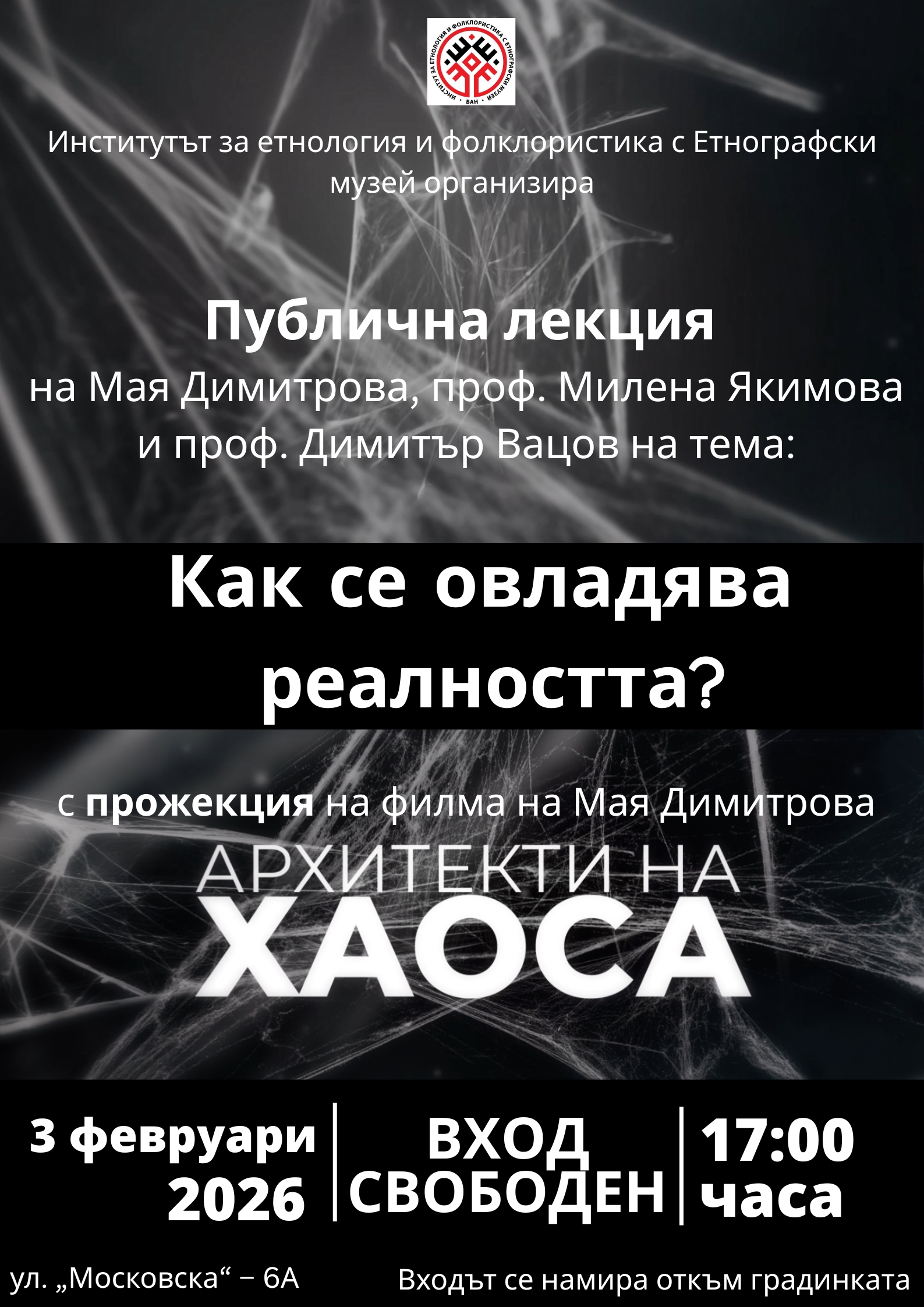 На 3 февруари от 17 часа в зала „Зимна градина“ на Института за етнология и фолклористика с Етнографски музей (входът е откъм градинката, ул. „Московска“ 6А) ще се състои прожекция на наградения документален филм на Мая Димитрова