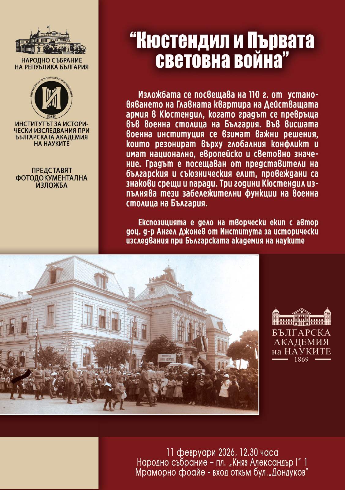Фотодокументална изложба „Кюстендил и Първата световна война“ ще бъде представена на 11 февруари 2025 г. 12:30 ч. в Народното събрание на Република България, Мраморно фоайе (пл. „Княз Александър I“1.).
